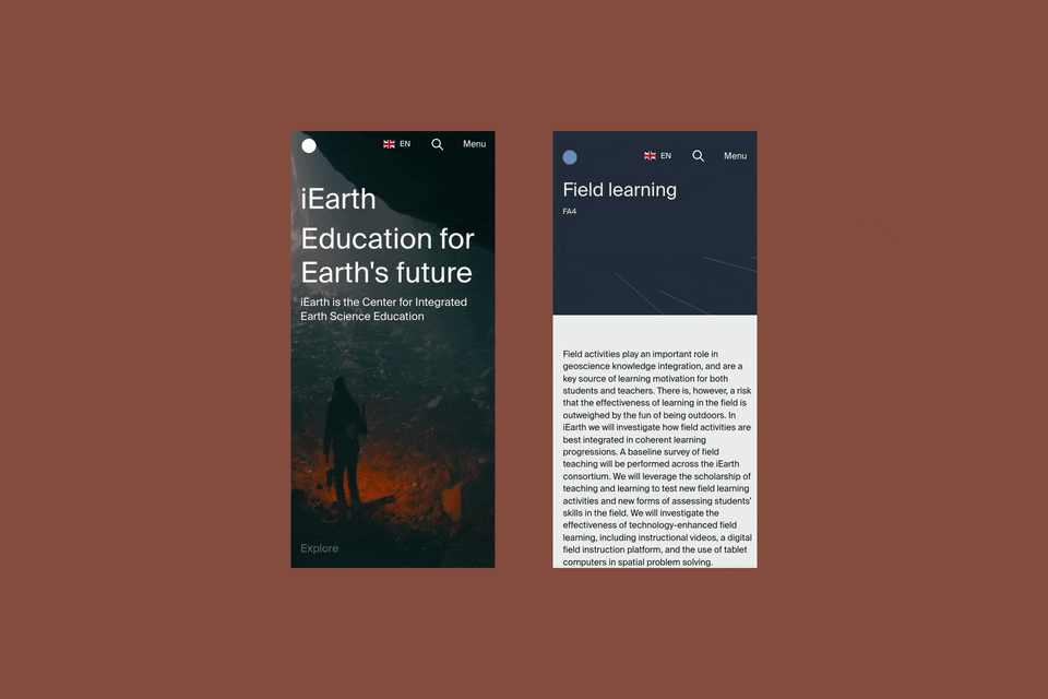 Results: In the visual universe, organic, "always changing" elements (the subjects of their studies) are harmonized with cinematic images and videos. The identity draws inspiration from the earth's surface, geographical grids, and infographics. Colors, influenced by earth elements, are versatile across various disciplines without constraints. The concept is further refined using graphic representations of the earth's divisions and the five disciplines within geosciences - Geohazard, Resources, Energy, Environment, and Climate. The goal is to make it easy for students and lecturers to find the needed information on the website by being both inspirational and informative.